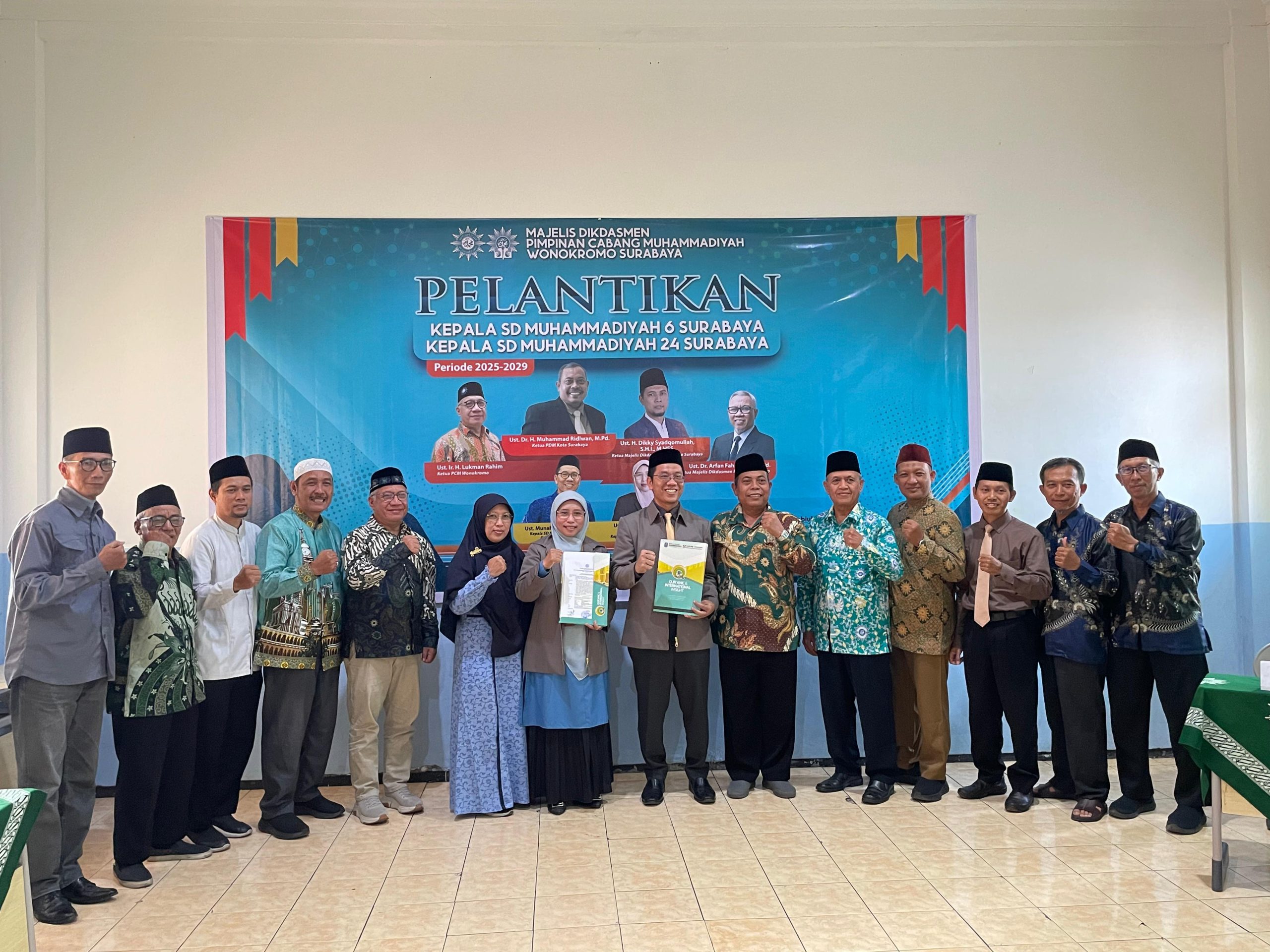 Ustadz Munahar, S.H.I., M.Pd., sebagai Kepala Sekolah Qur’anic and Internasional Insight SD Muhammadiyah 6 Gadung, dan Ustadzah Norma Setyaningrum, S.Pd., M.Pd., sebagai Kepala Sekolah Karakter SD Muhammadiyah 24 Ketintang. Keduanya memasuki periode ketiga kepemimpinan, masa bakti 2025–2027.