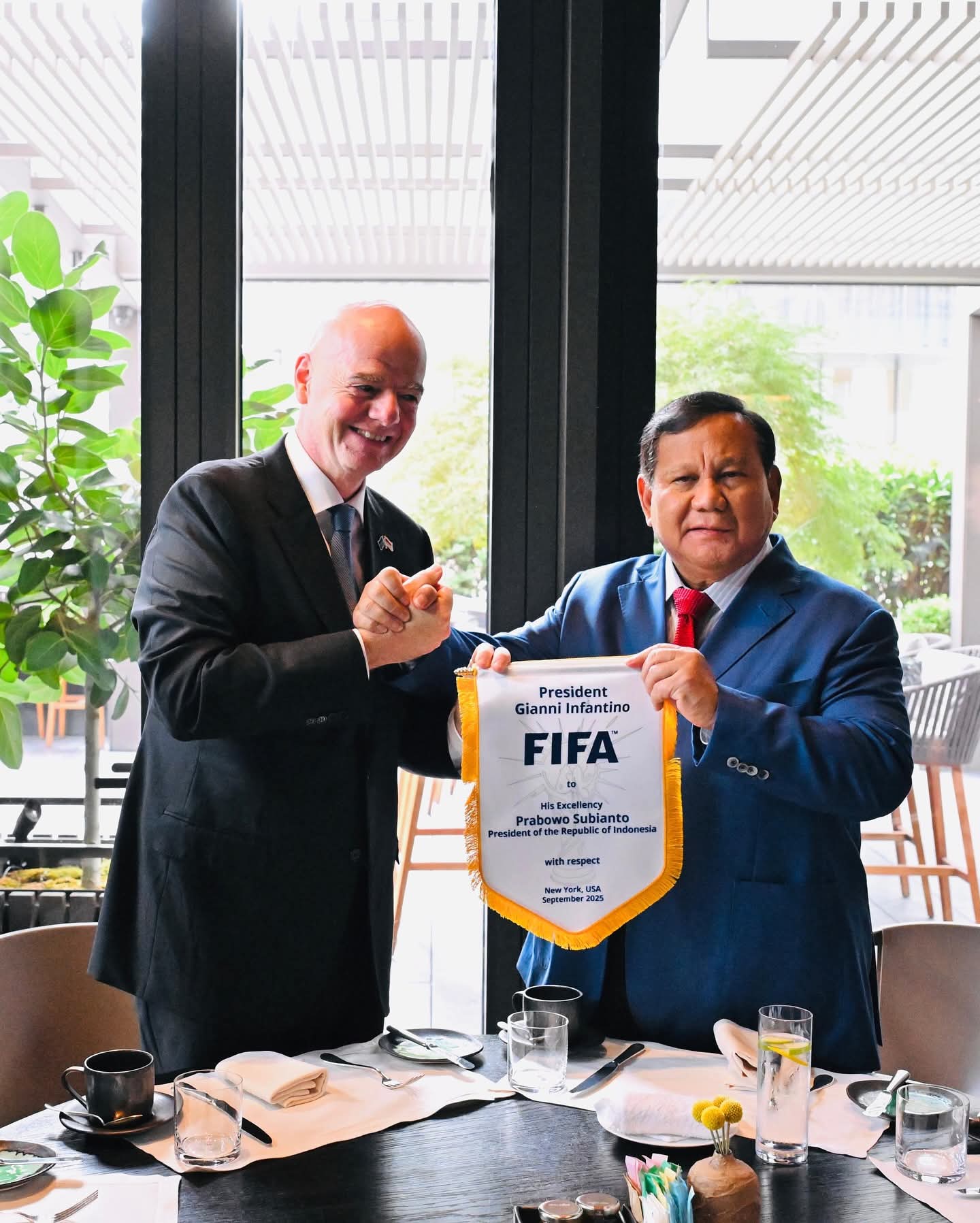Presiden RI Prabowo Subianto menerima kunjungan Presiden Federasi Sepak Bola Internasional (FIFA) Gianni Infantino di New York, Amerika Serikat, Rabu (24/09/2025). Pertemuan ini menjadi momentum strategis untuk membahas perkembangan pesat sepak bola Indonesia, sekaligus memperkuat komitmen kerja sama antara Indonesia dan FIFA.